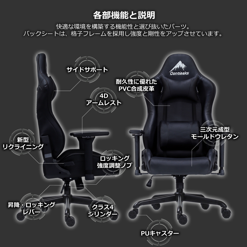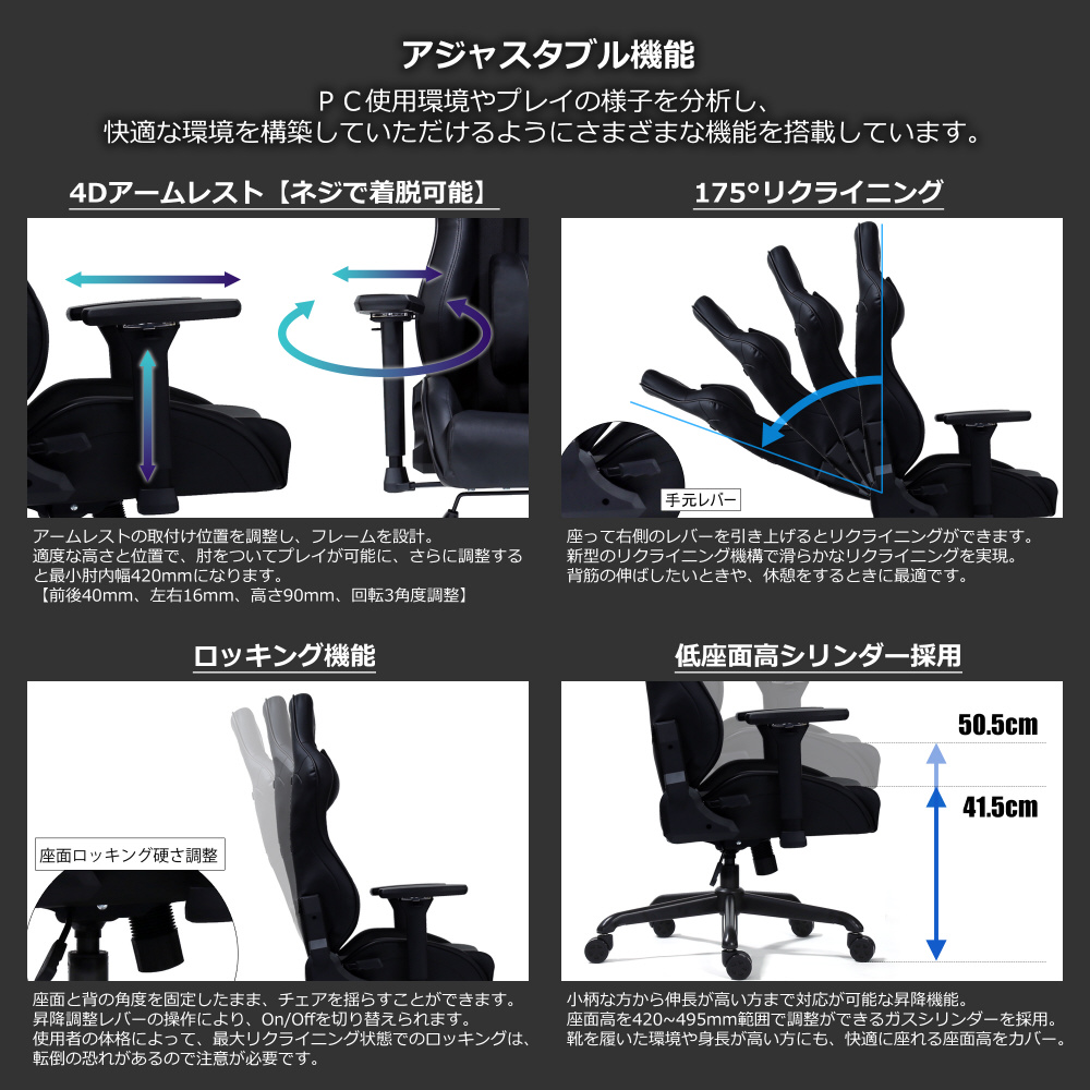 アームパッドの位置調整機能で前後位置・左右位置・首振角度・上下高さ調整が可能な4Dアームレストを採用。