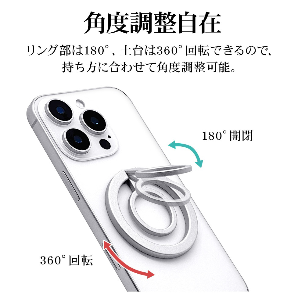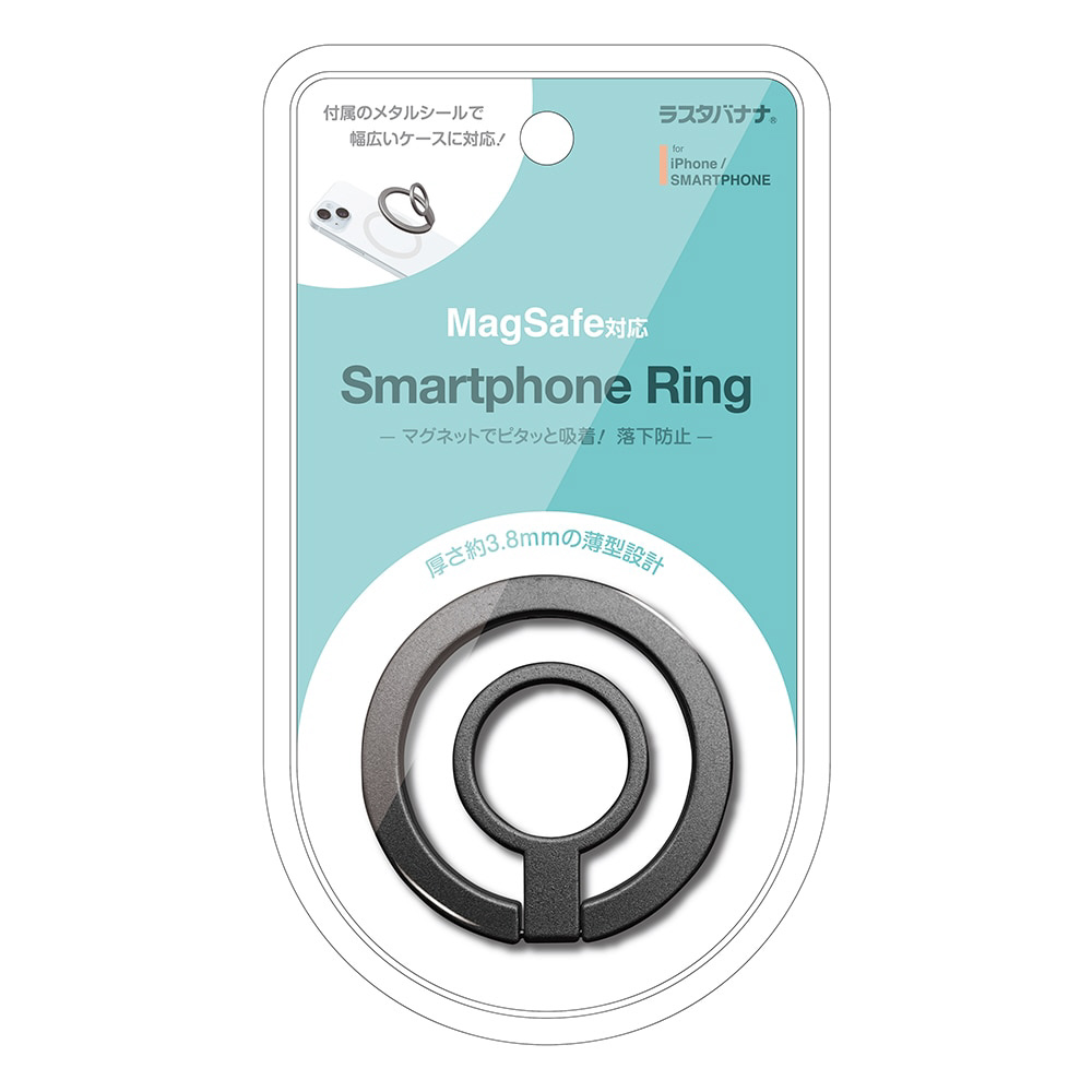 MagSafe対応iPhoneの背面に磁石の力で取り付けることができるマグネット式薄型(3.8mm)スマホリングです。