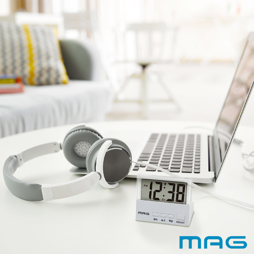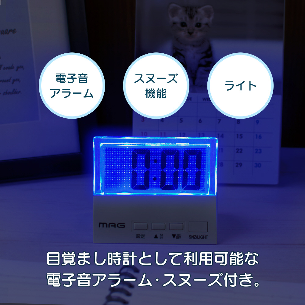 手のひらサイズのシンプルな目覚まし時計はわずかなスペースでも圧迫感なくご使用いただけます。