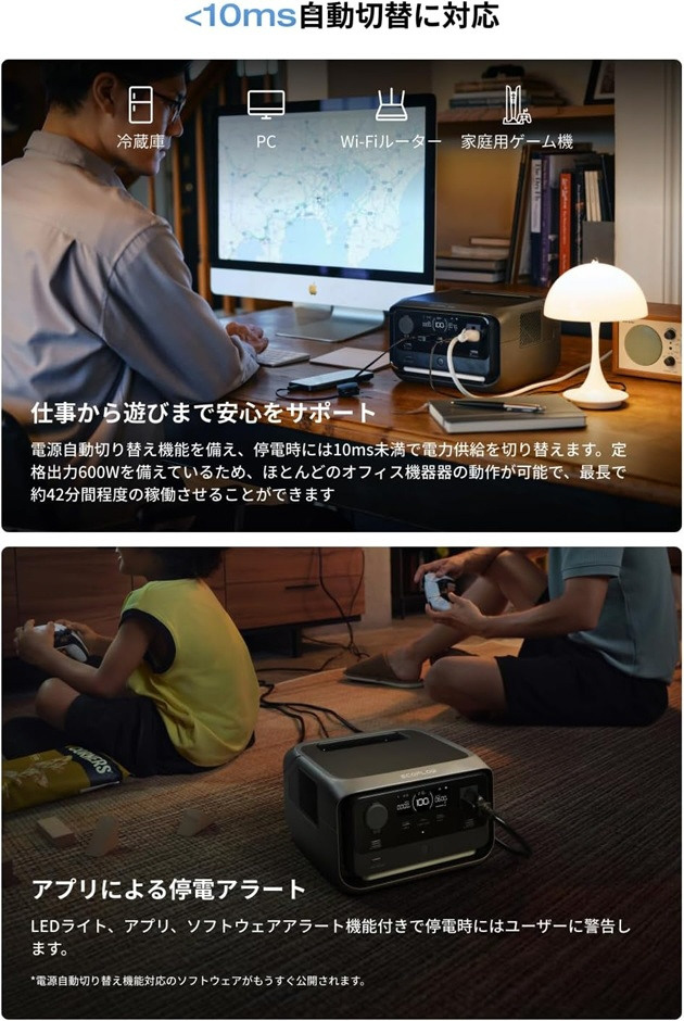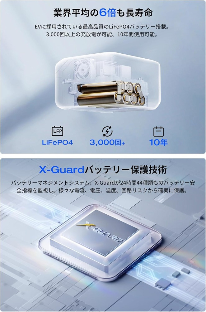 出力ポート AC 出力:3口、合計600W 、X-Boost 900W 、瞬間最大(サージ)1200W\nDC 出力:USB-A x 2、USB-C x 1、車載シガーソケット x 1