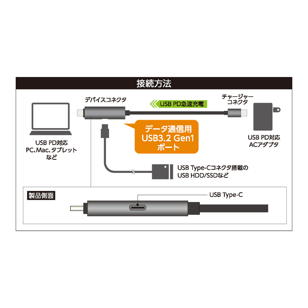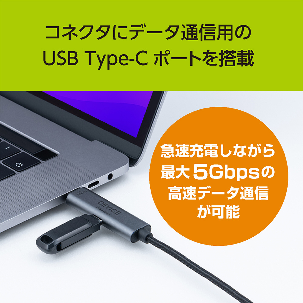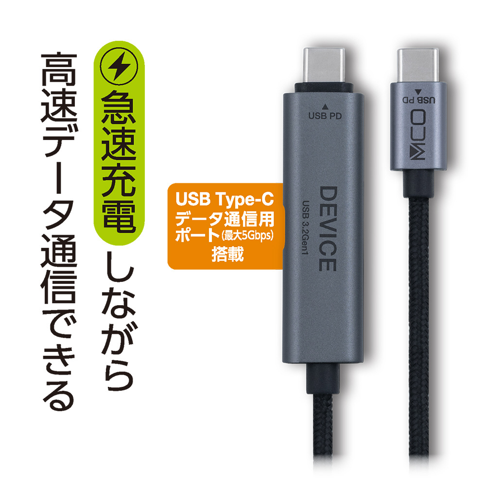 データ通信用のType-Cポートを搭載したUSB PD充電ケーブル