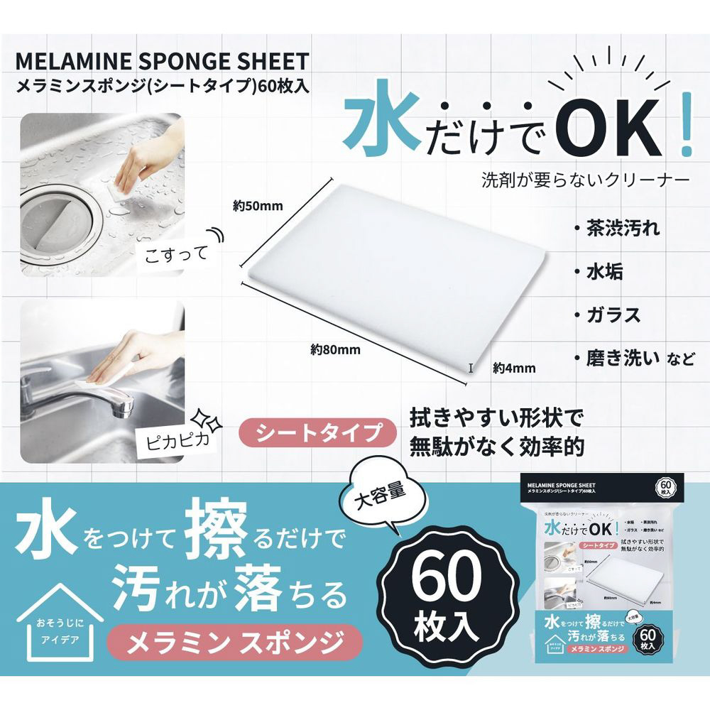 水をつけて擦るだけで汚れが落ちるメラミンスポンジです。水をつけてこするだけで水垢、ガラスについた汚れ、茶渋汚れなどが簡単キレイに落ちます。メラミン素材なのでキッチンシンクの磨き洗いにも使えます。シートタイプで無駄がなく効率的にお使いいただけます。【仕様】シートタイプ60個入