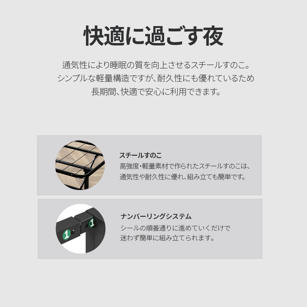 ・スチールすのこ・・・高強度・軽量素材で作られたスチールすのこは、通気性や耐久性に優れ、組み立ても簡単です。