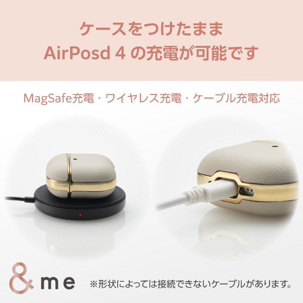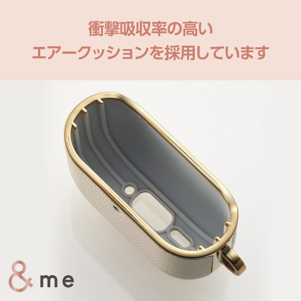 AirPods 4 ケース 用 ソフトレザー カバー ( ワイヤレス / MagSafe 充電対応 ) 衝撃吸収 落下防止 カラビナ付 メッキ加工 &me グレージュ AVA-AP06PLMJGB