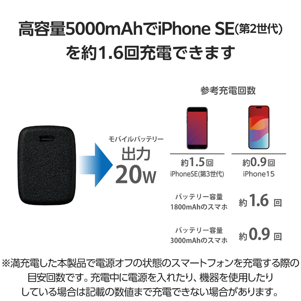本製品(バッテリー容量5000mAh)で、1800mAhのスマートフォンを約1.6回、3000mAhのスマートフォンを約0.9回充電可能です。