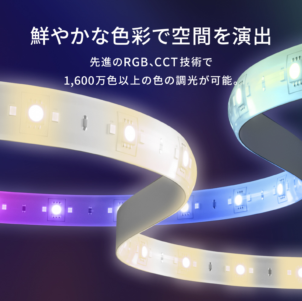 先進のRGB、CCT技術を採用し、1,600万色以上の色の調光が可能です。また、温かみのある白の照明としても使用でき、色調を自由に調整して部屋の雰囲気を演出することができます。