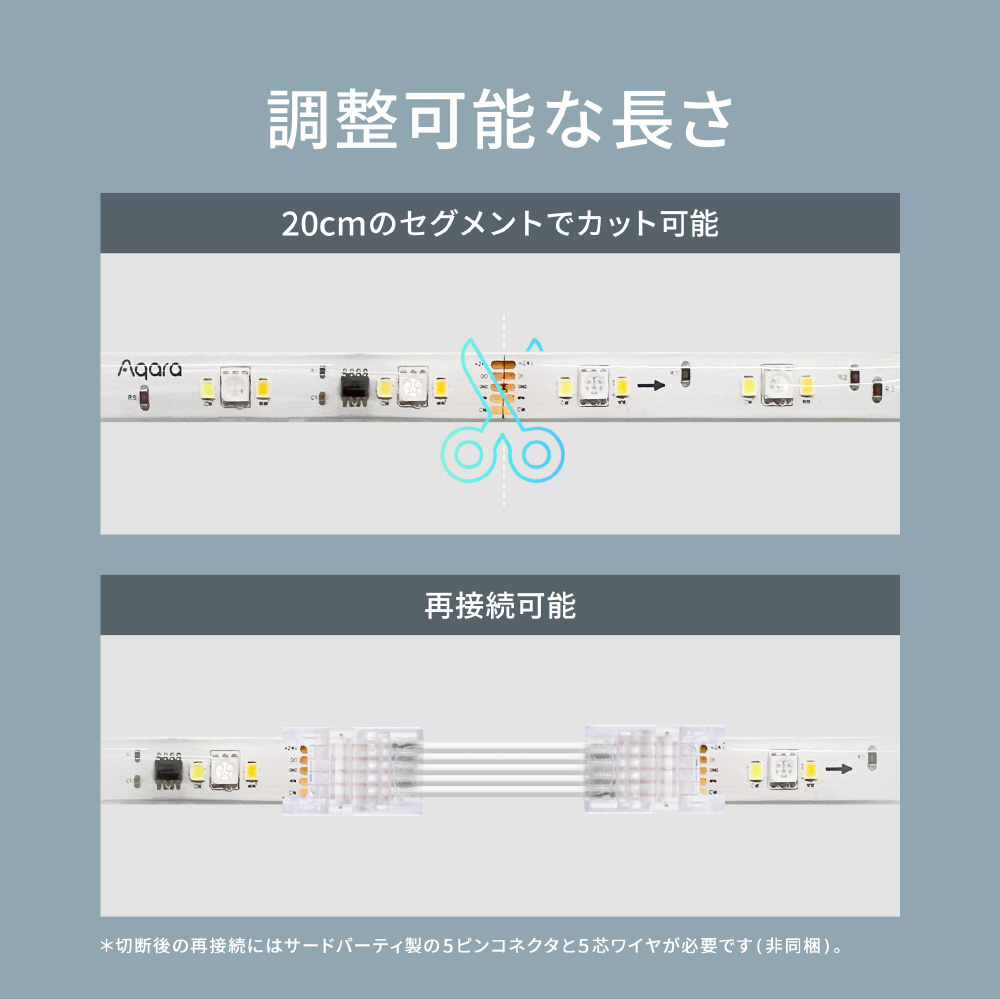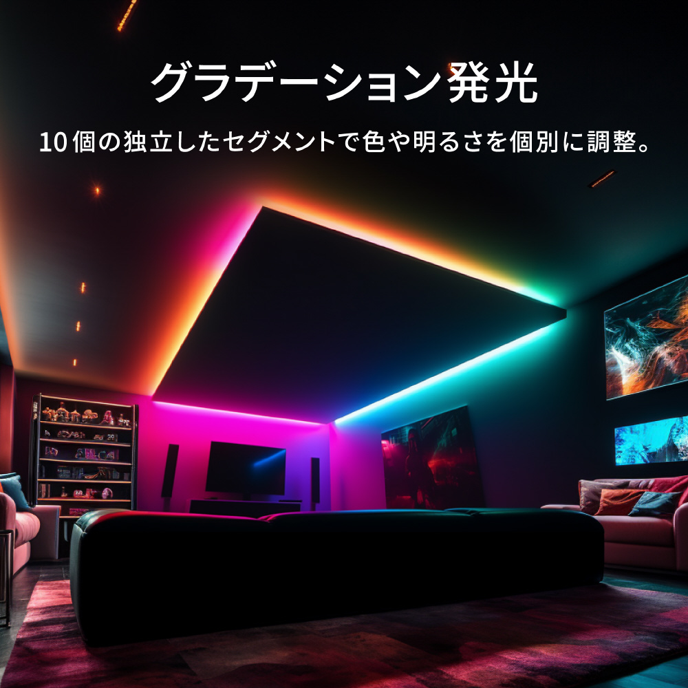 LEDテープライトT1は、10個の独立したセグメントで構成されています。お好みや使用シーンに応じて各セグメントの色や明るさなどを個別に調整できるので一本で色を変えたり、グラデーションカラーを調光したり、使う人の創造力を存分に発揮できます。(※)