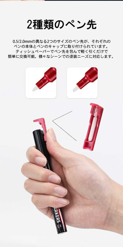 本体キャップ部分に交換用のペン先が付属。0.5mm、2mmのペン先により、お好みで付け替えができます。