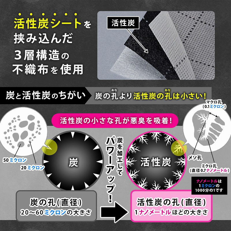 通気性が良く厚みのある不織布(目付75g/m2)を使用し丈夫で破れにくい。活性炭生地の箇所は[不織布+活性炭シート+不織布]の3層構造で、しっかりしているので積み重ねもできる。