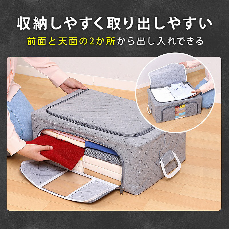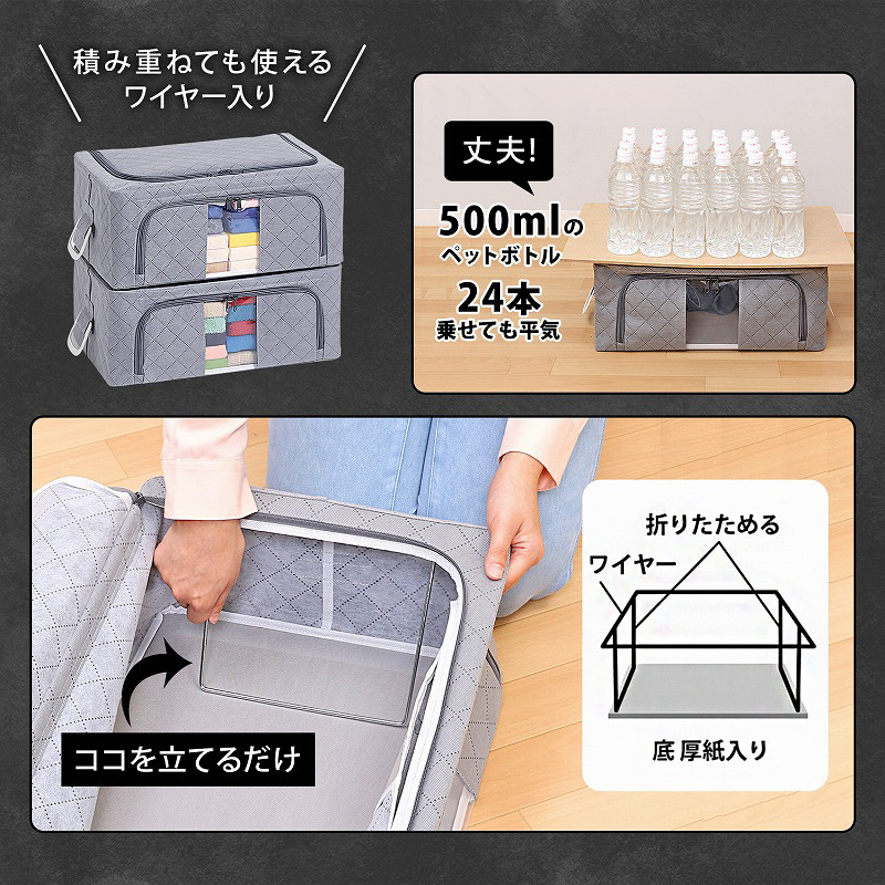 ワイヤーと厚紙入りの底面でケースの形状をしっかりキープ。丈夫で積み重ねて使える(耐荷重12kg)。使わないときはワイヤーを折りたたんでスリムに収納。ダブルドア仕様で上からと前からの2箇所から衣類の出し入れができる。前面の透明窓で収納したまま中身が確認できる。