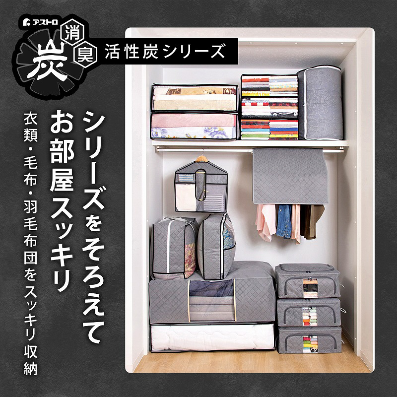活性炭のチカラで消臭保管。活性炭シートがにおいをしっかり消臭。オフシーズンの衣類などをにおい・ホコリ・汚れからしっかり守る。