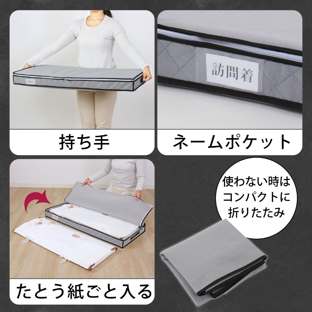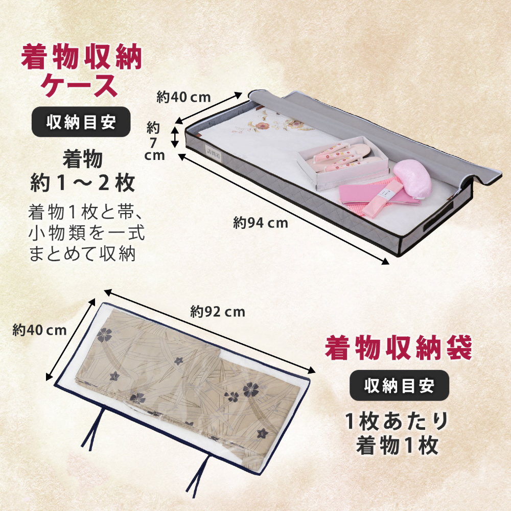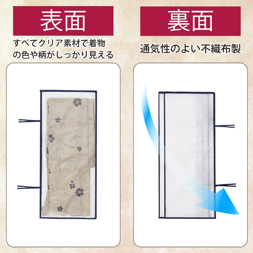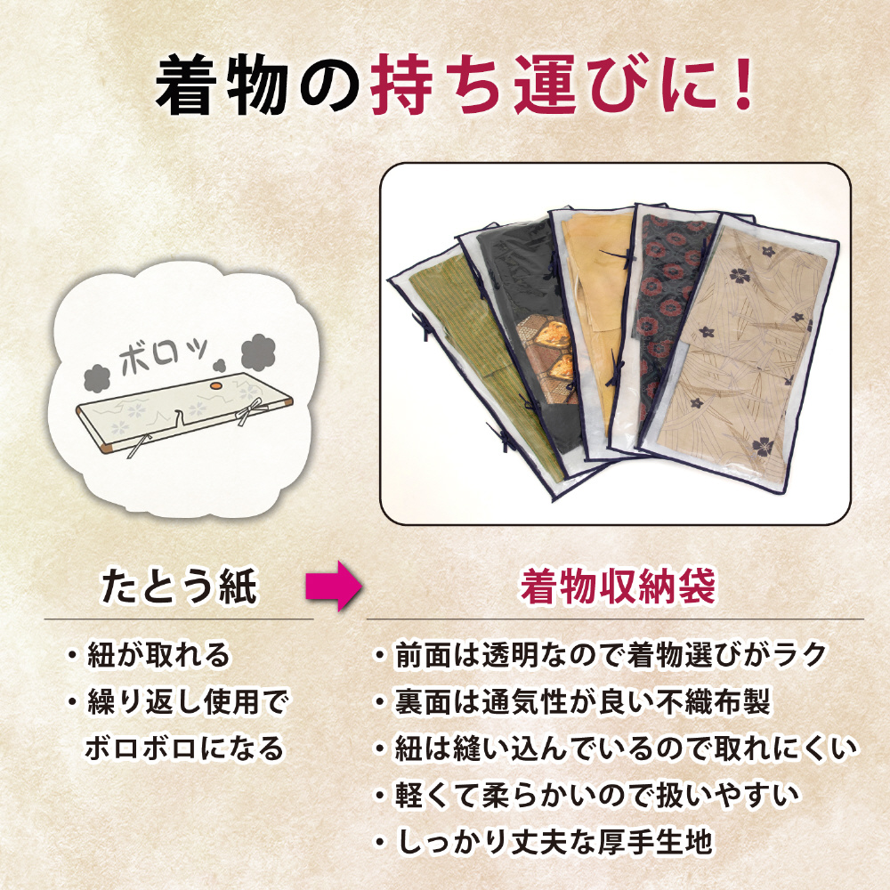 保管袋の開閉は2か所のひもを結ぶかほどくだけ。ファスナーを使用していないので着物を傷つける心配いらず。保管袋やたとう紙に着物を入れたままケースに収納可能。:収納ケースはダブルジップファスナーで3辺が開くので着物の出し入れがスムーズ。