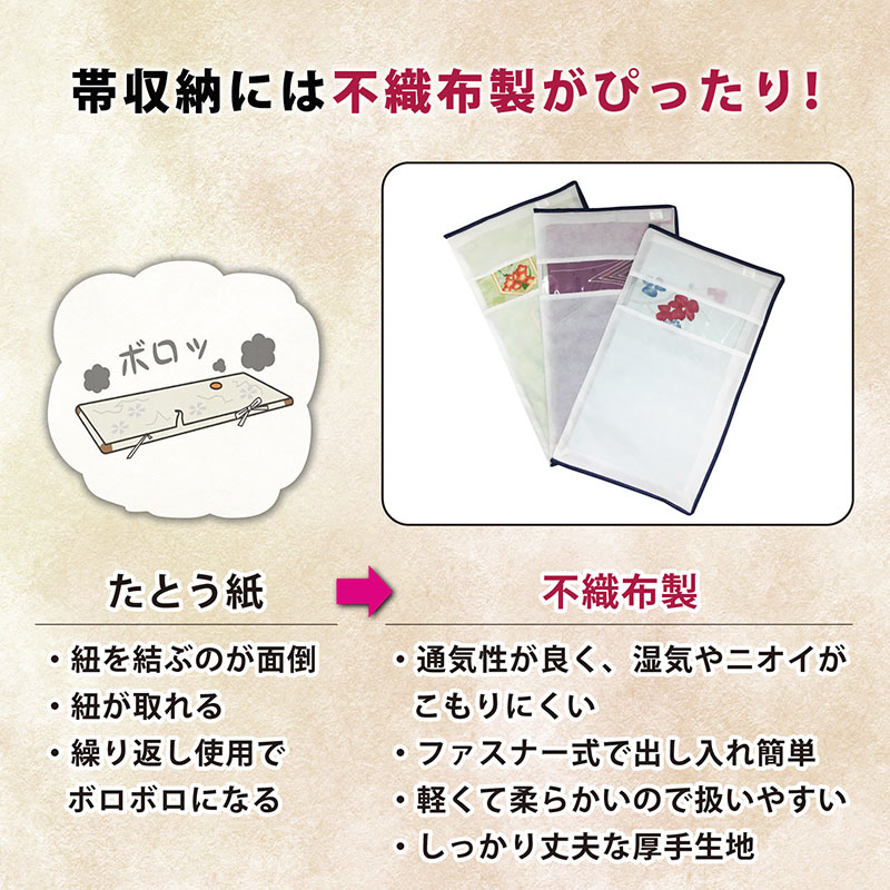 湿気やにおいのこもりにくい通気性の良い不織布製。大切な着物の帯をホコリから守り保管できる。