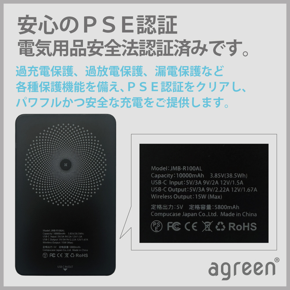 超薄型アルミ製マグセーフ残量%付き(PD20W)10000mAh agreen シルバー JMB-R100AL-SV