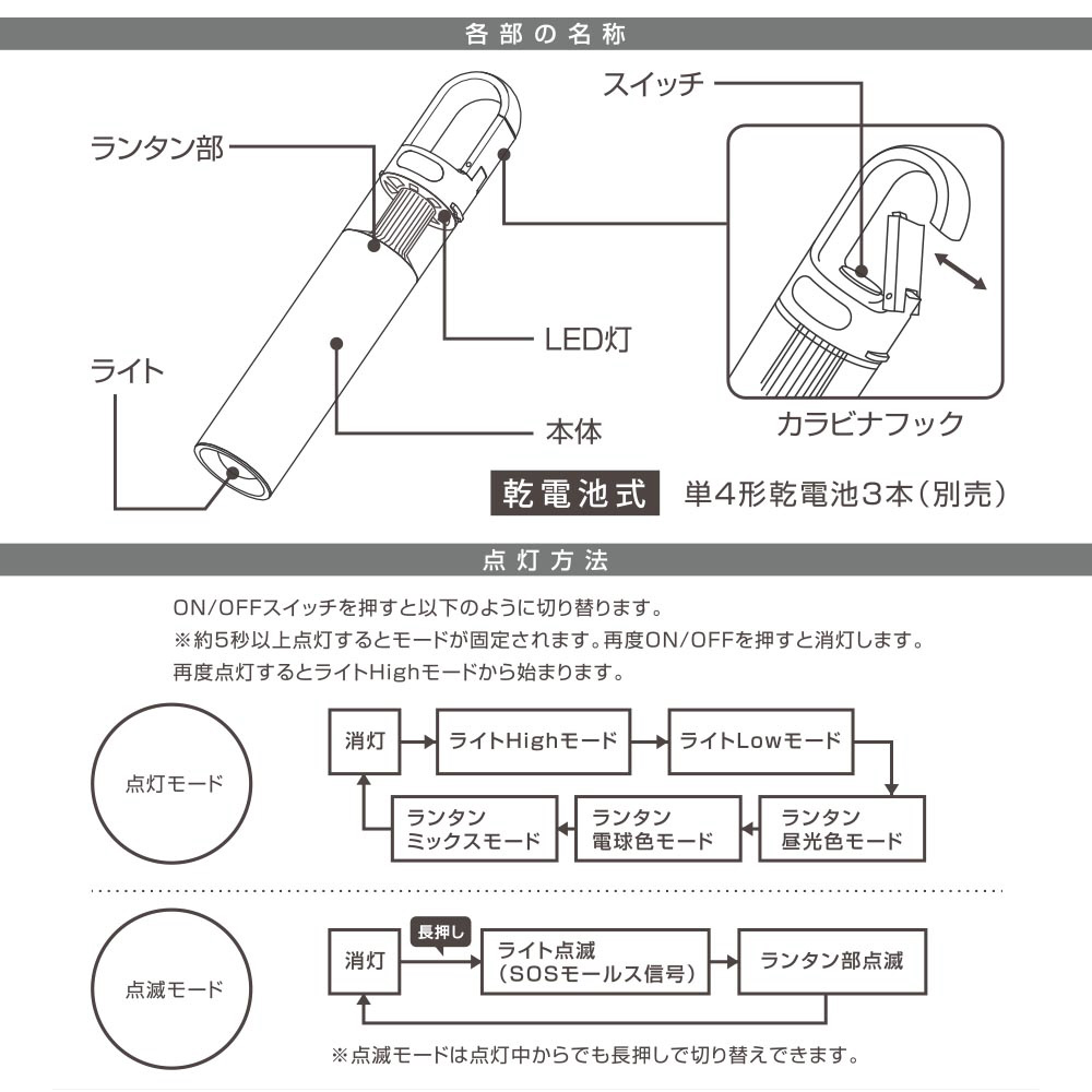 ● 点滅モード2種類(ライトSOSモールス信号点滅/ランタン部点滅)