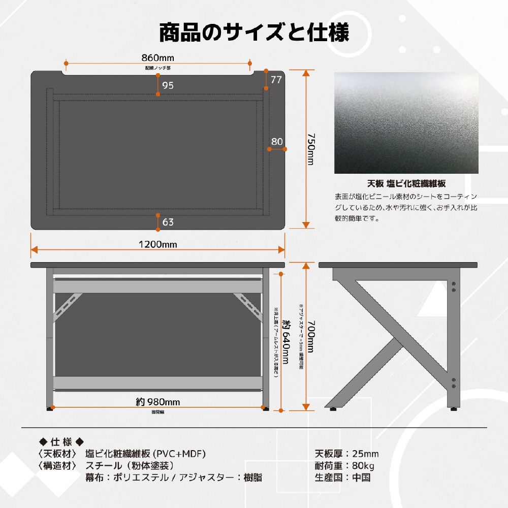 塩ビコーティング天板は、梨肌のエンボス感ある表情。スチールフレームは、粉体塗装しマットな質感に仕上げました。