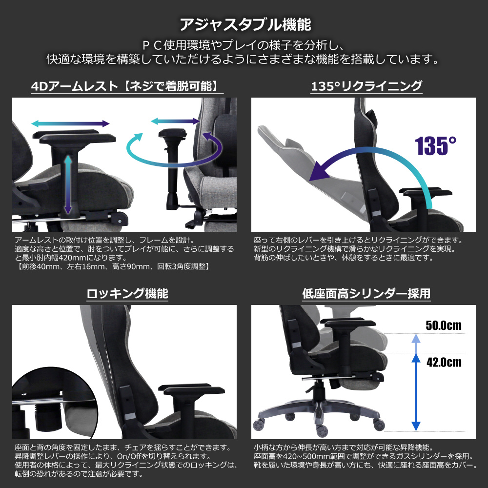 アームパッドの位置調整機能で前後位置・左右位置・首振角度・上下高さ調整が可能な4Dアームレストを採用。