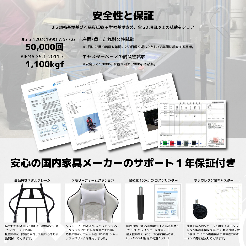 ANSI(米国国家規格協会)が認定したアメリカのBIFMA基準の試験をクリア+JIS規格に基づく品質検査+自主検査含め、全20項目をパス。