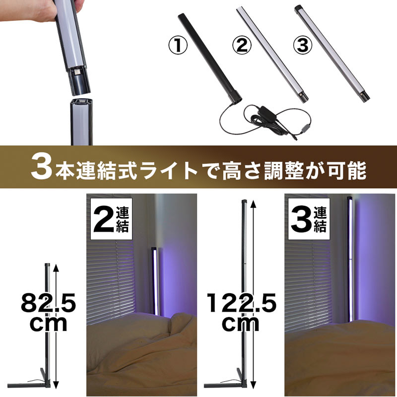 RGBコーナーフロアライトは、3本のライトを1つに繋いだライトで、高さを変えることができます。
