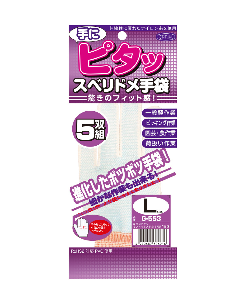 ●一般軽作業・ピッキング作業・園芸作業・農作業におすすめの手にピッタリとフィットするスベリ止め手袋。3双組●材質:手袋/ナイロン100% スベリ止部/塩化ビニル樹脂●サイズ:L
