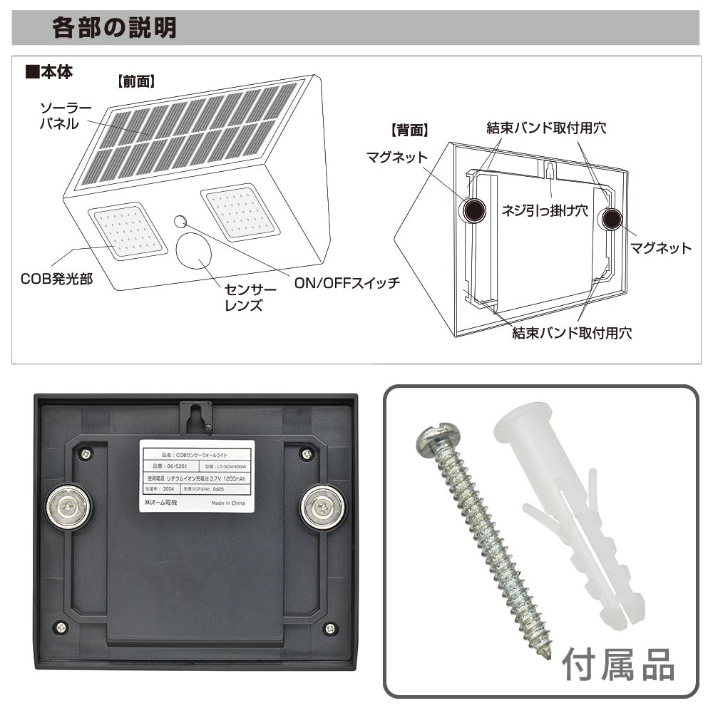 COBセンサーウォールライトソーラー式400ルーメン オーム電機 LT-SOW40DW