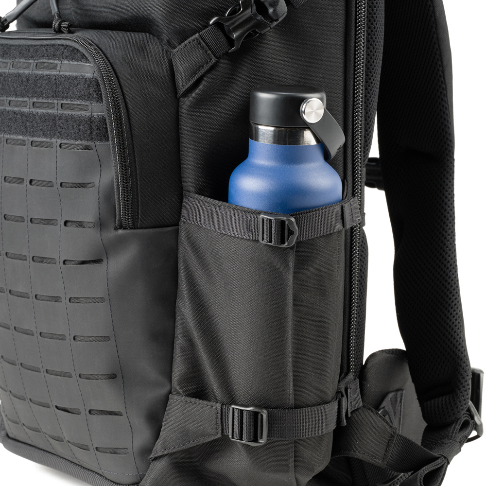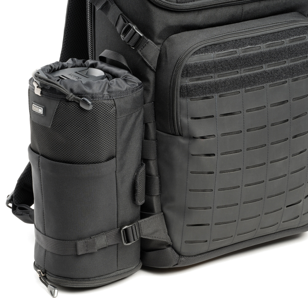 右側に設けられているサイドポケットにはウォーターボトルや三脚を収納可能で、さらに三脚等を固定できるバックル、アジャスター付きのコンプレッションストラップが付いており、安定した持ち運びを叶えます。