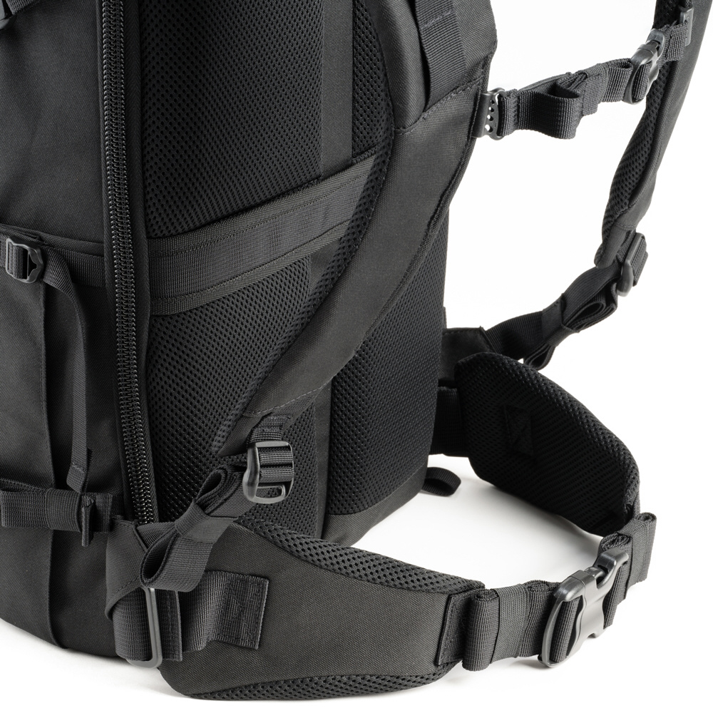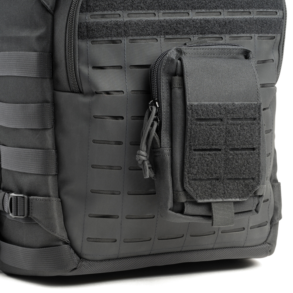 バッグのフロントパネルにはレーザーカットされたモールパネルを備え、複数のアタッチメントポイントがあり、ポーチ等を取り付けて容量の拡張もできます。ポーチはバッグ左側にも取り付けが可能で、より多くの荷物を持ち運びたい場合に便利です。