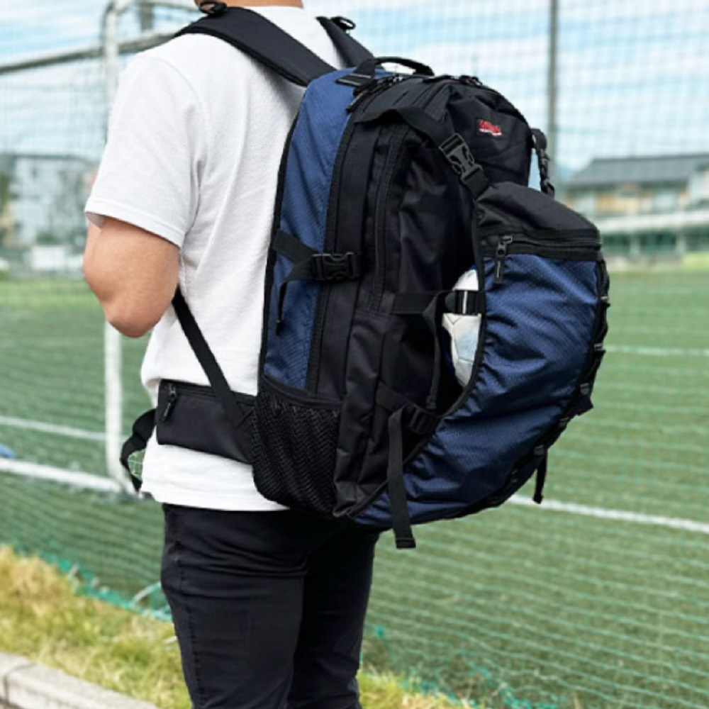 ヘルメットやボールの収納に悩む方におすすめの大容量リュックサックです。外部に設けられた専用収納スペースで、ヘルメットを他の荷物と分けて持ち運び可能。ボールなどのスポーツアイテムも収納でき、多目的に使えます。