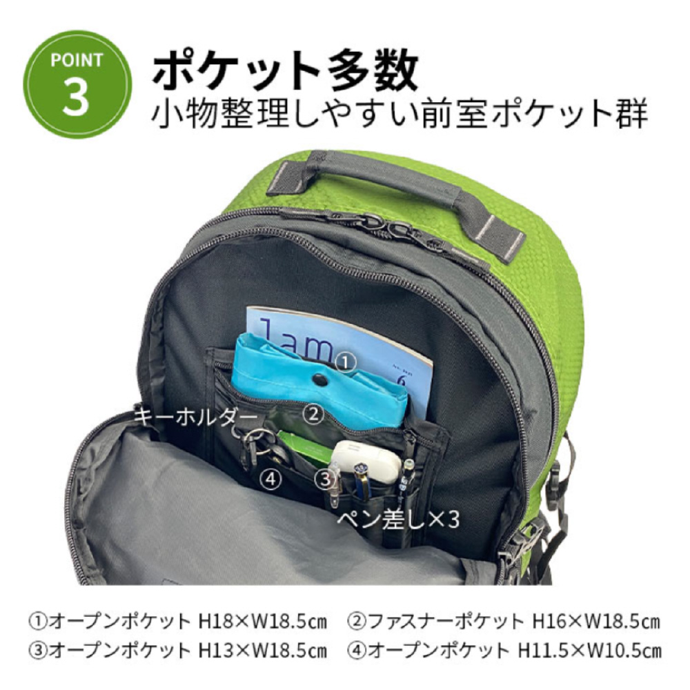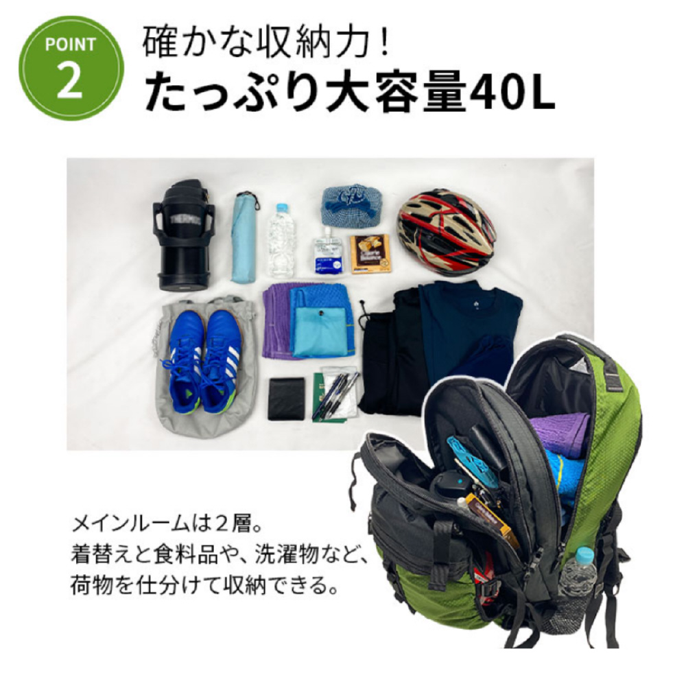 大容量設計(40L):着替えや水筒も楽々収納可能で、荷物が多い方にも安心。
