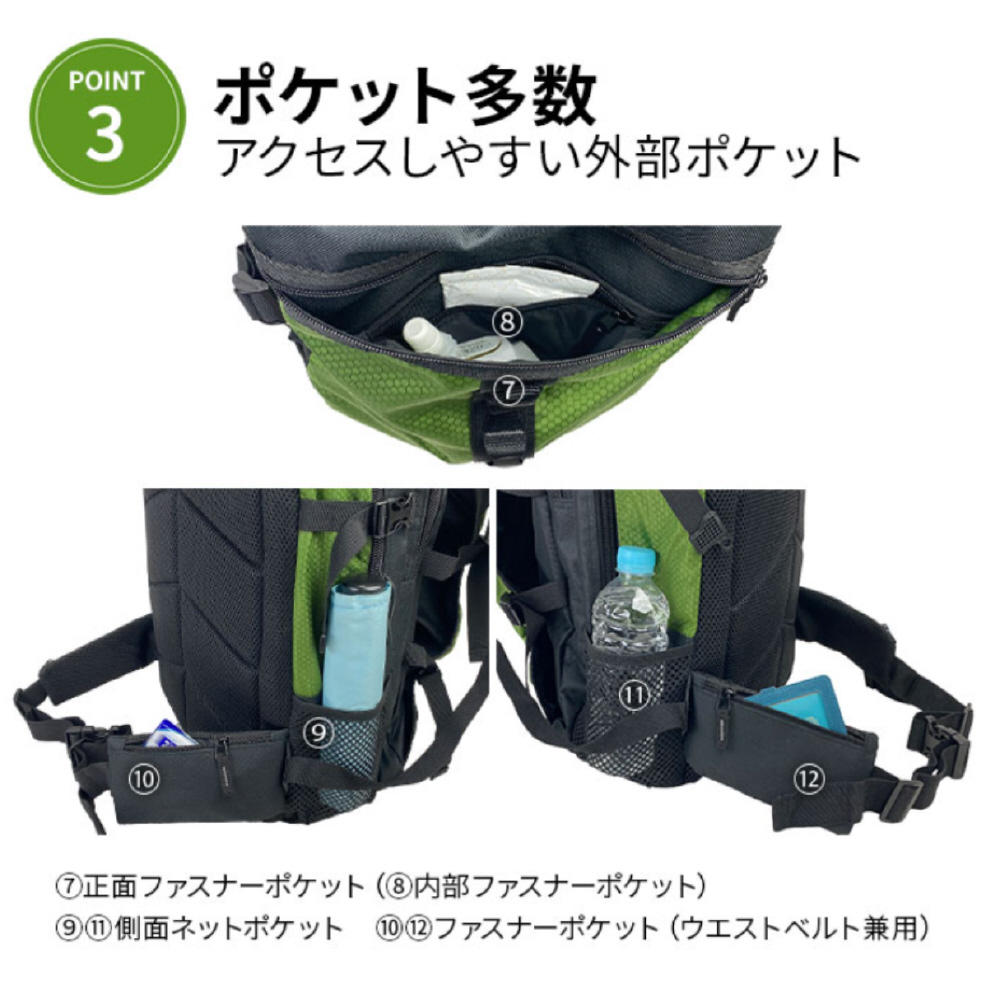 12のポケットで効率的:内外に複数のポケットを配置し、通勤やスポーツ時の荷物を整理整頓できます。