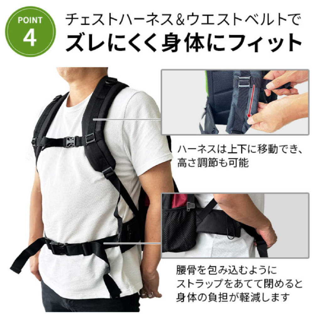 抜群のフィット感:ズレ落ちを防ぐチェストハーネス&ウエストベルト付きで、快適に背負えます。