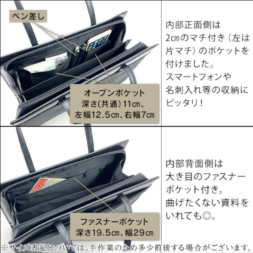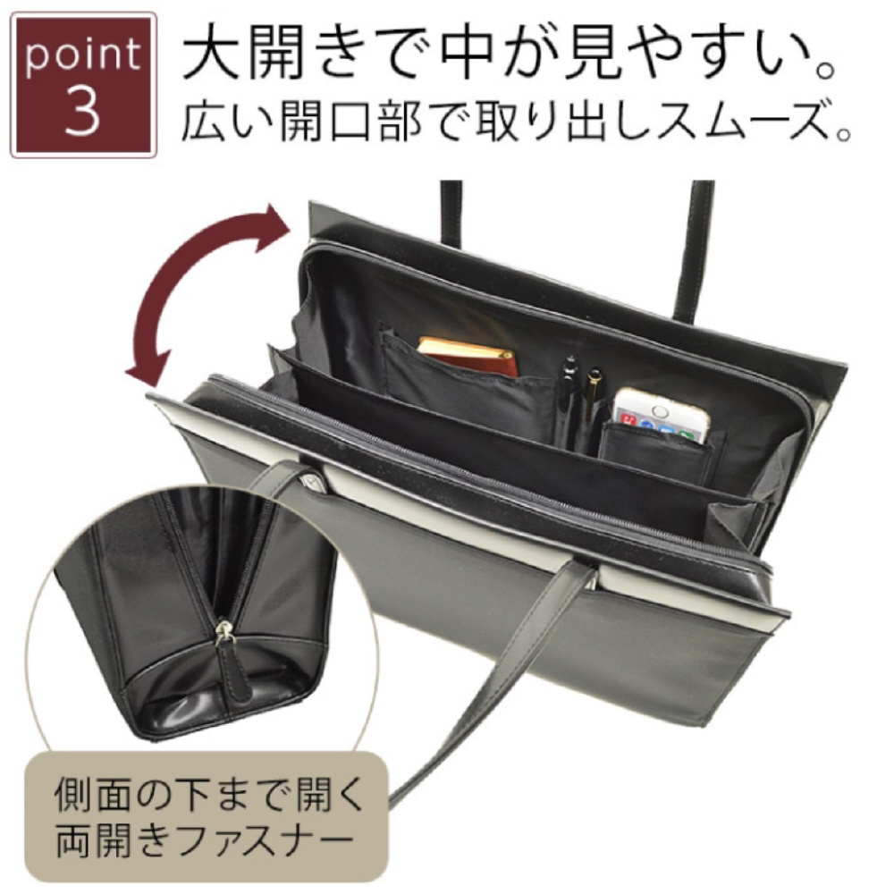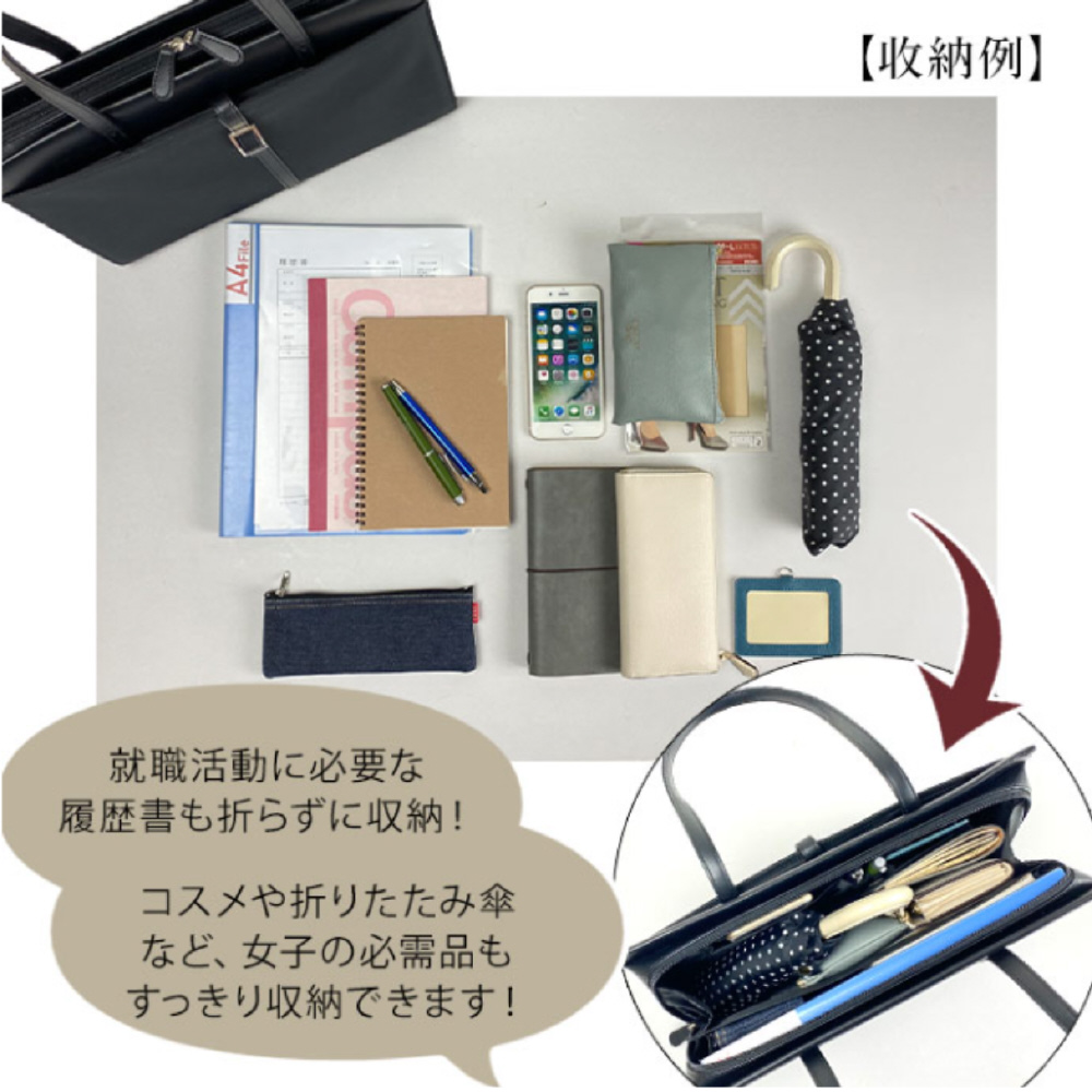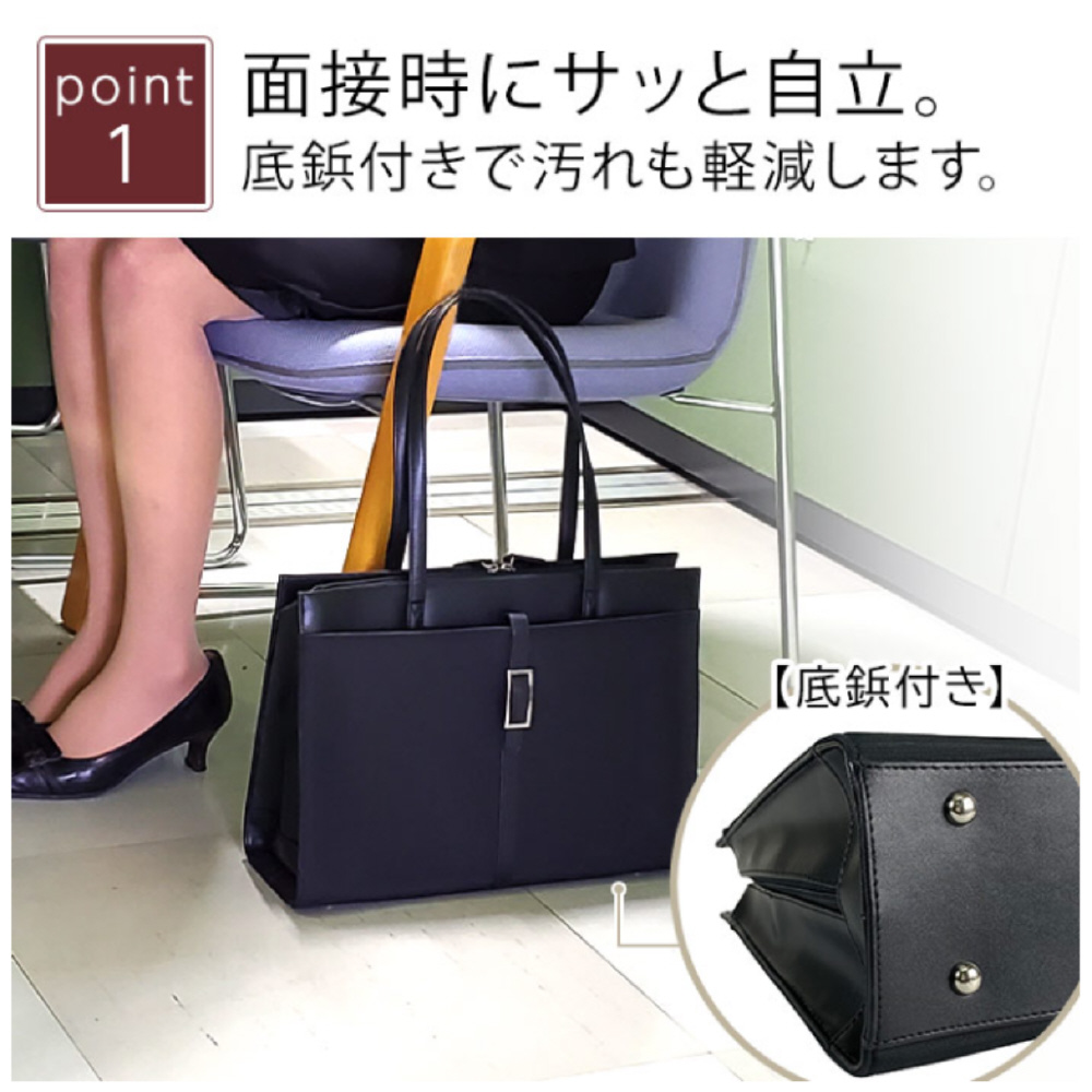 バッグは自立するので、面接時や移動中も安定して置くことが可能。大開き仕様で必要なものがすぐに取り出せます。