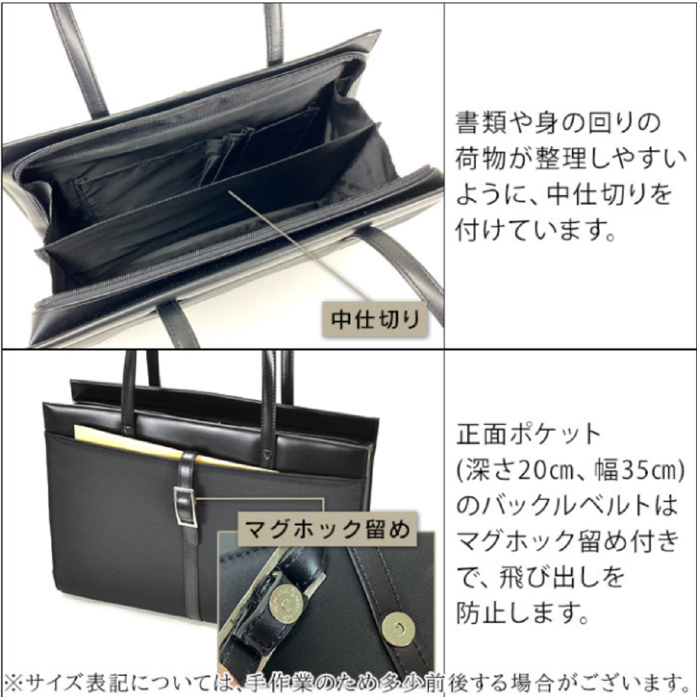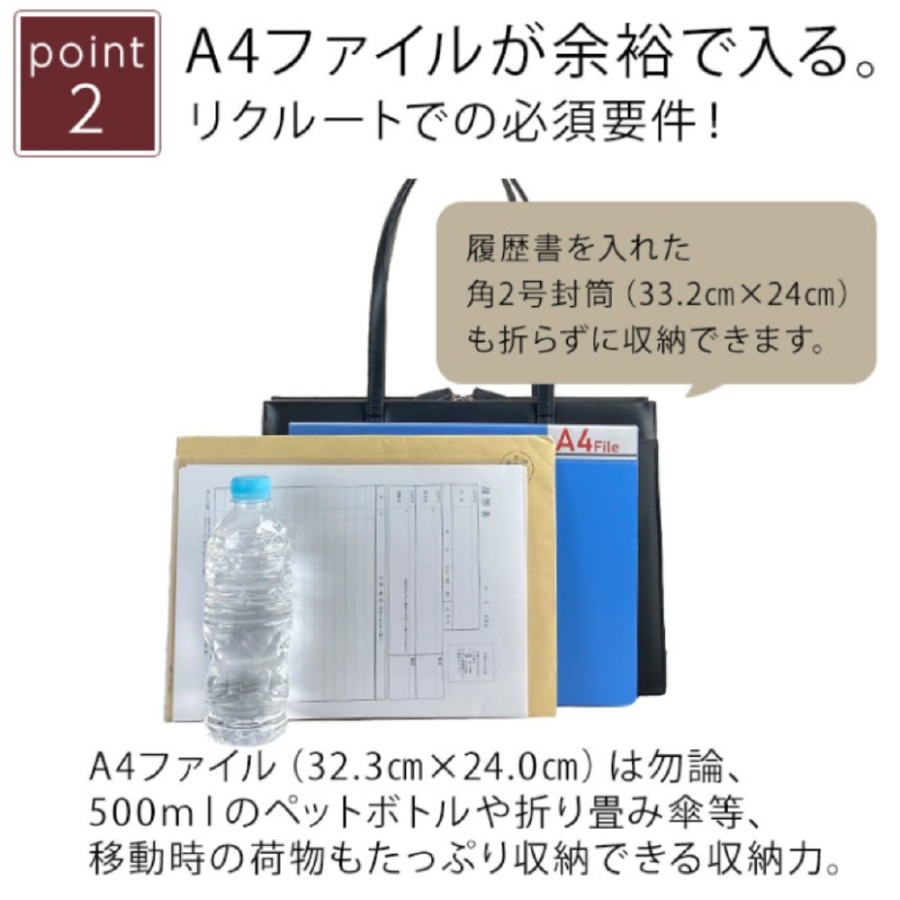 履歴書や資料、コスメポーチ、ペットボトルなどをすっきり整理できる大容量設計。中仕切り付きで荷物を分けて収納できます。