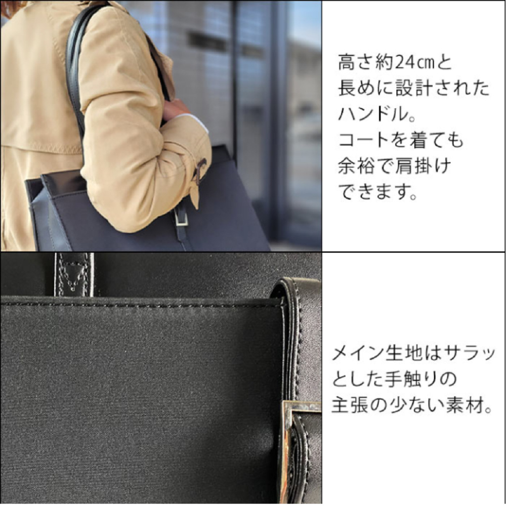 ハンドルは長めに設計されており、ジャケットを着たままでも快適に肩掛けが可能です。