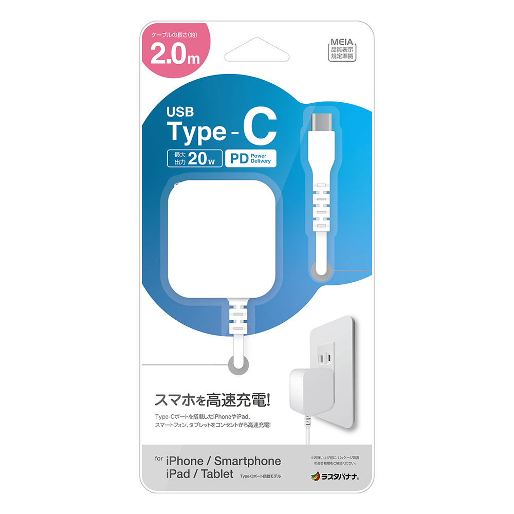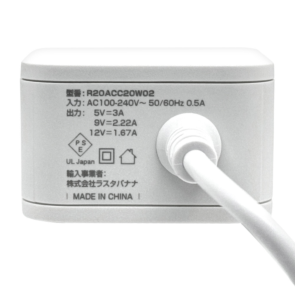 AC充電器 ケーブル直付Type-C PD20W 2m ホワイト R20ACC20W02WH
