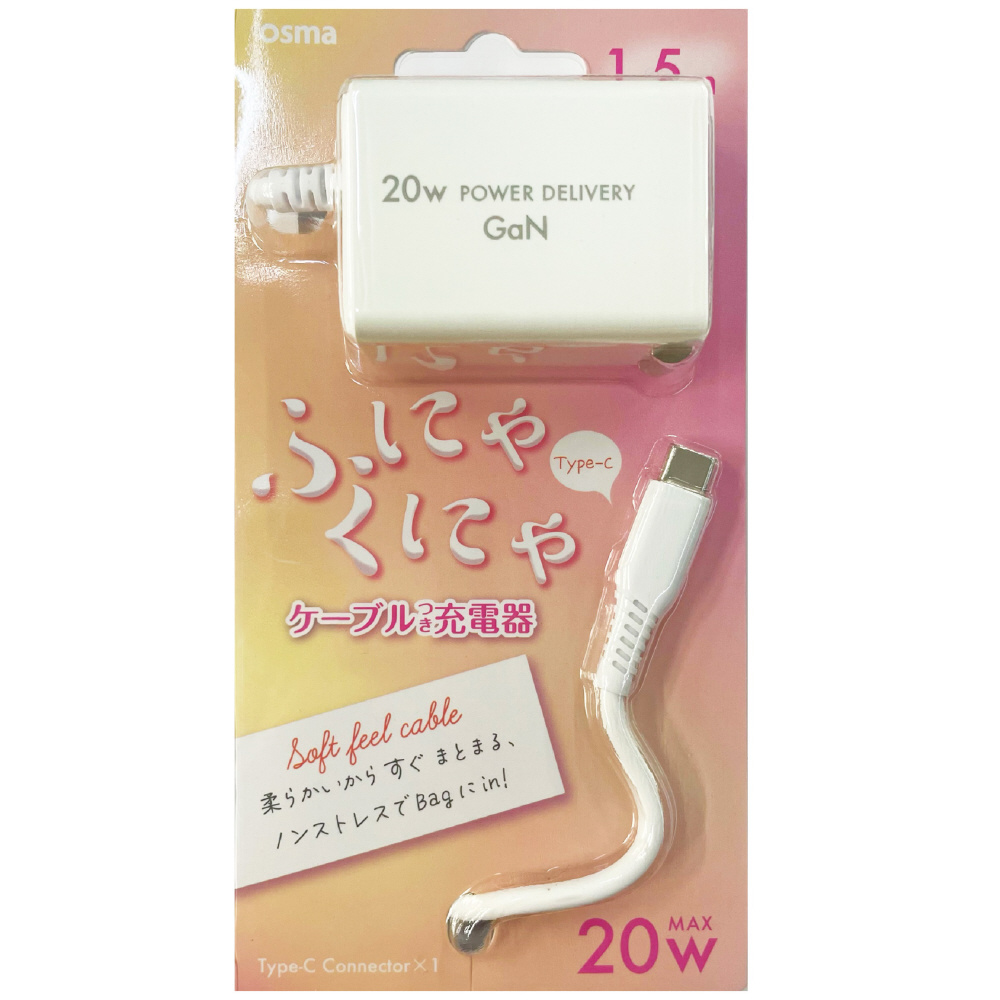 [PD20W]シリコンケーブル一体型Type-C用AC充電器 1.5m ホワイト AC-C20PGSKWH [USB Power Delivery対応 /20W /GaN(窒化ガリウム) 採用]
