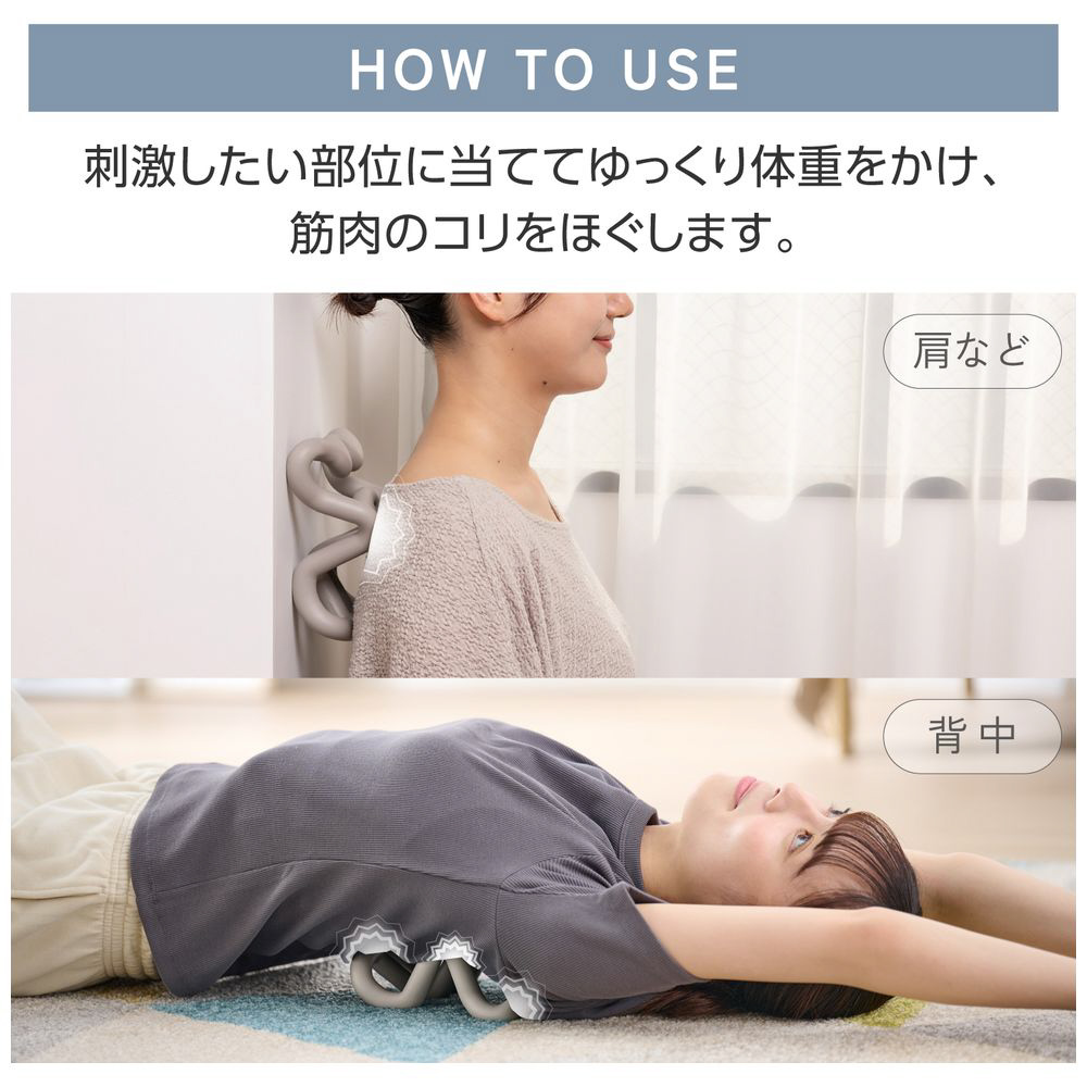 背中の筋肉をじんわりほぐす。気になる部位を気持ちよく刺激する、指圧代用器です。おうちでいつでも気軽に使えて、“ながらのコリほぐし”にぴったりです。