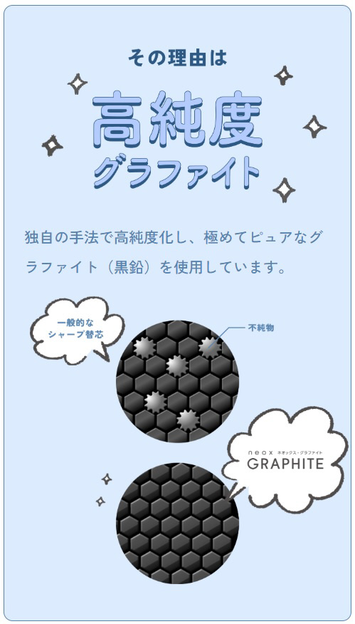 『ネオックス・グラファイト』は、高純度グラファイト(黒鉛)を使用した、濃くなめらかな書き味と芯の強度、汚れにくさが特長のシャープ替芯です。2010年の発売以来、多くの学生の学習を支えてきました。