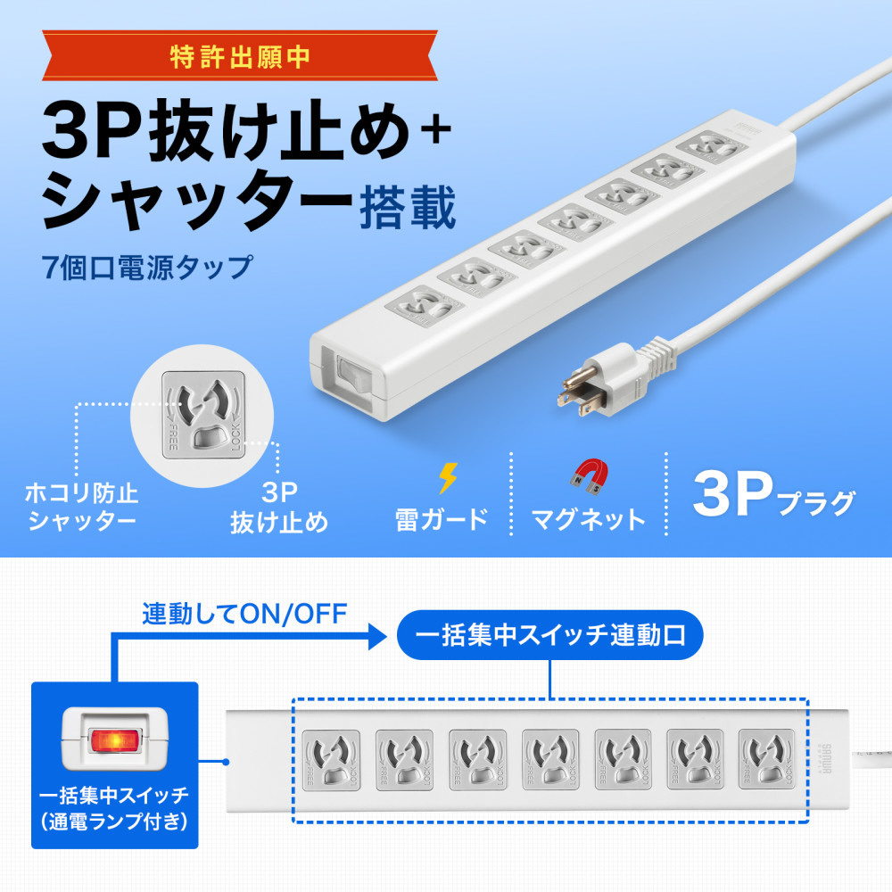 3P抜け止め7個口、集中スイッチ、マグネット、シャッター付き、雷ガード付き