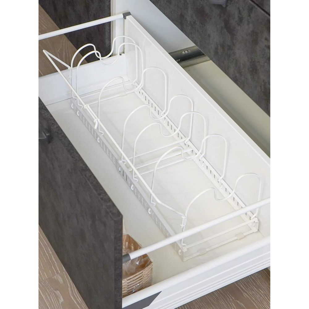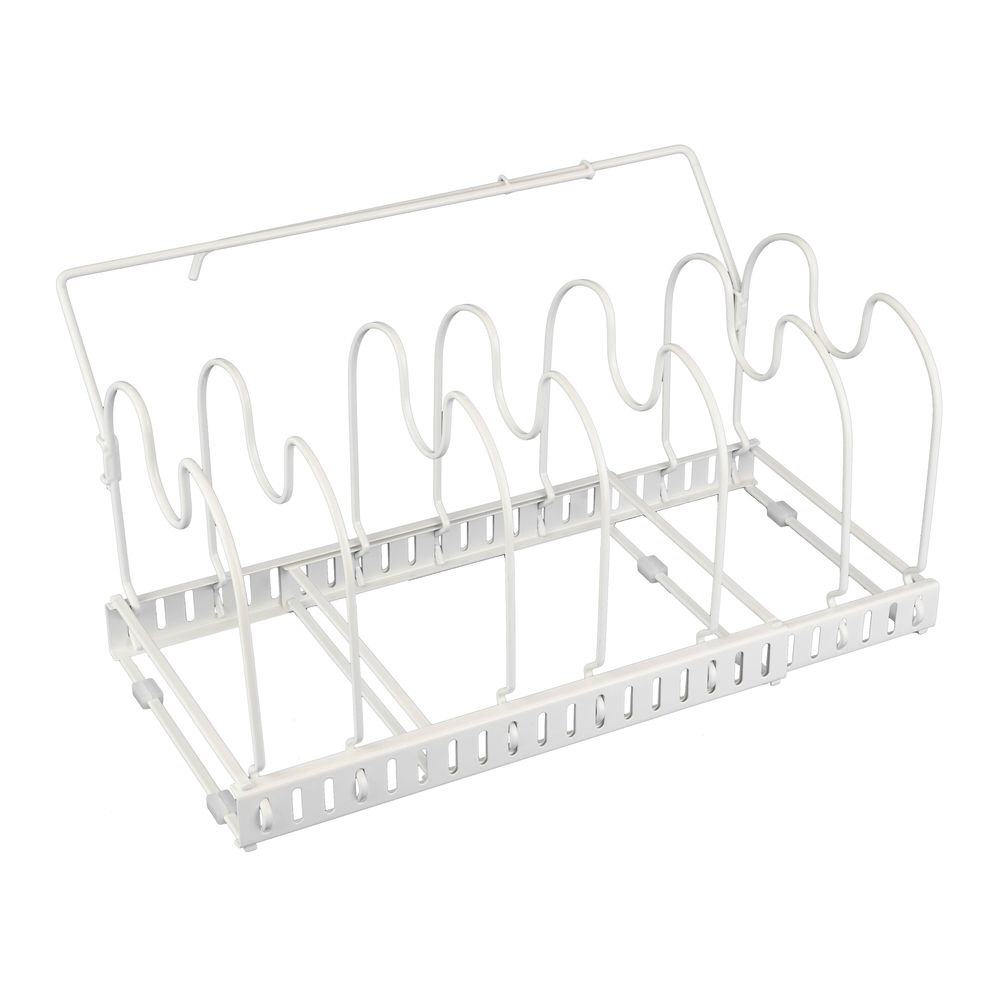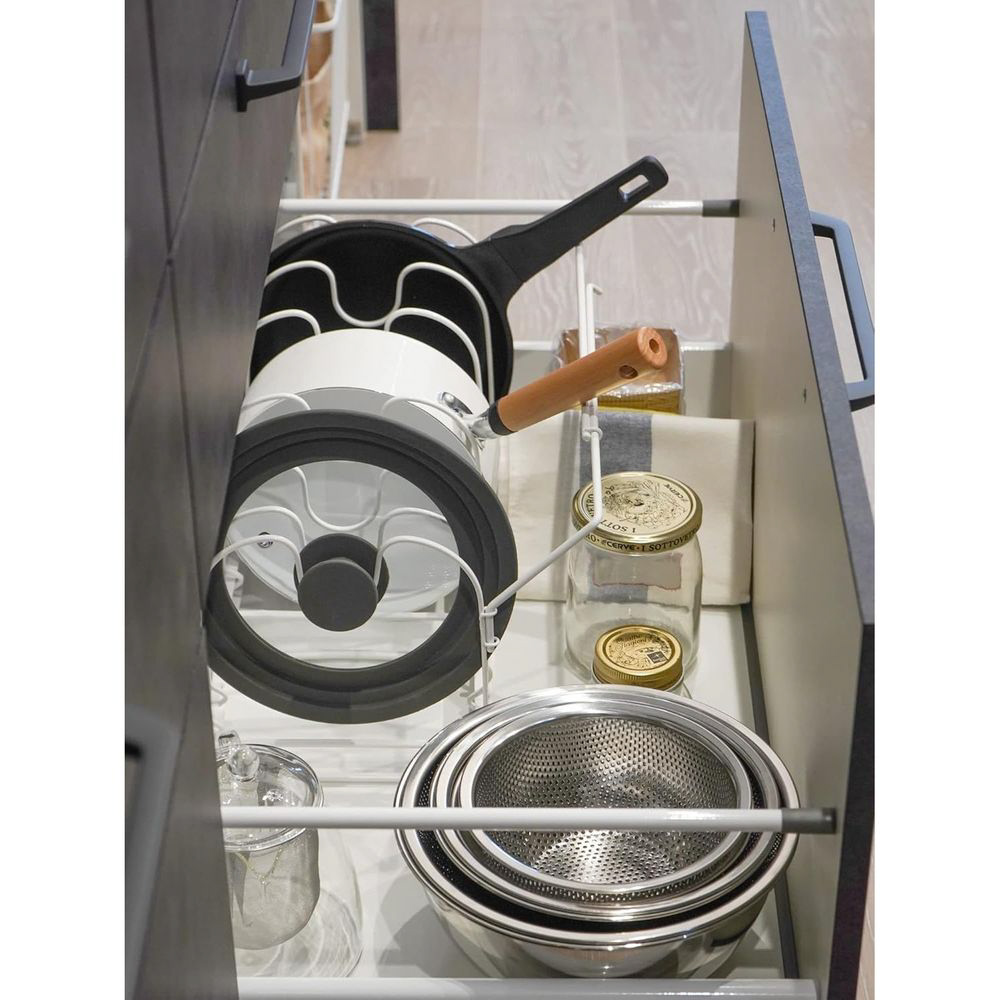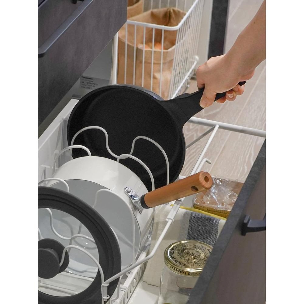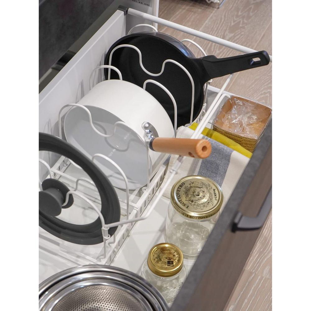 ラックを活用すれば収納空間を増やせます。フライパンラックで下部収納を有効に利用できます。設置する場所に合わせてピッタリ伸縮できます。ストッパー付きでフライパンの柄が安定し、取り出しやすい。
