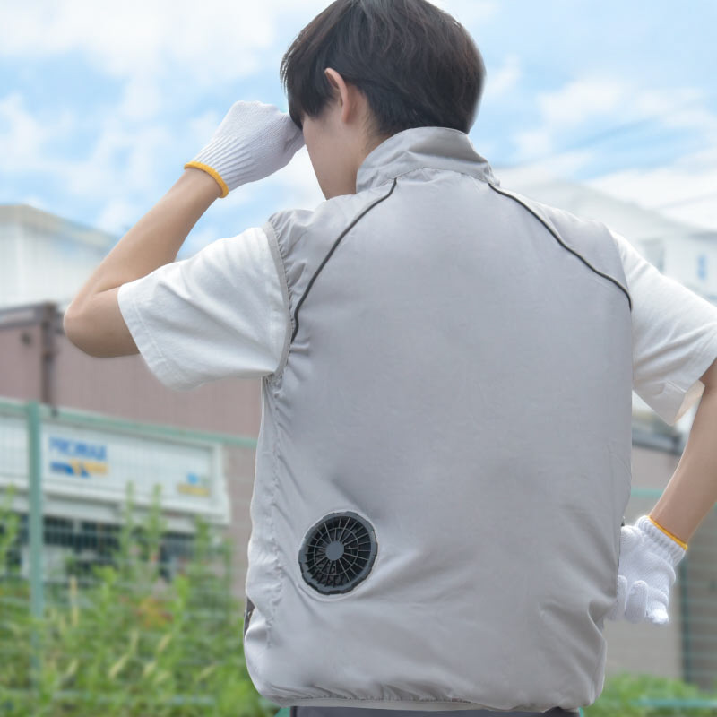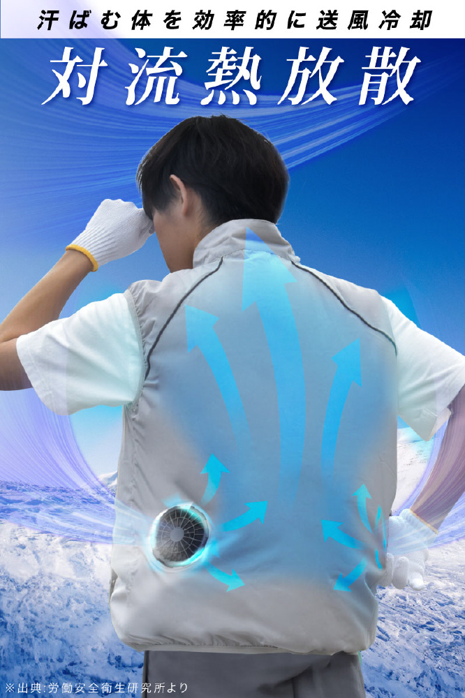 空調作業服は、人に備わっていない「汗の蒸発機能」を作り出します。風で汗を蒸発させ、その気化熱で体温を下げることで冷却機能を発揮します。
