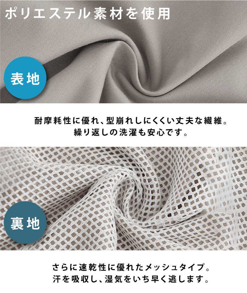 ・表地・裏地にはポリエステルを使用。耐摩耗性に優れ、型崩れしにくくい丈夫な繊維。繰り返しの洗濯も安心です。