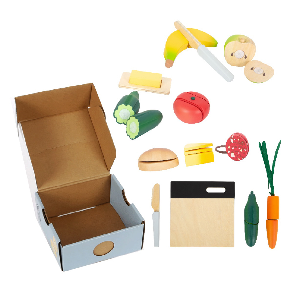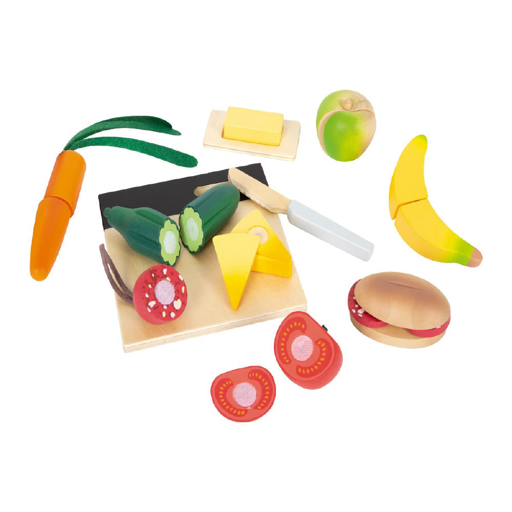 野菜、フルーツ、パンといろいろな食材が揃います。コンパクトなまな板と包丁もあり、食材を切ったり、パンにはさんでサンドイッチを作ったりとあそびが広がります。