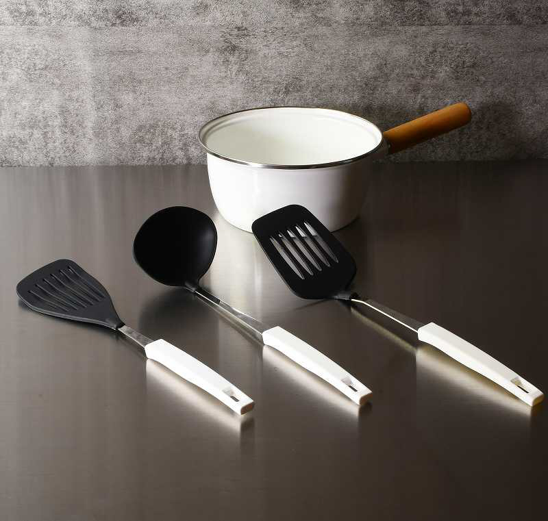 仕様2 材質:金属部=ステンレス鋼 皿部=ナイロン(耐熱温度200度) ハンドル=ポリプロピレン(耐熱温度110度)