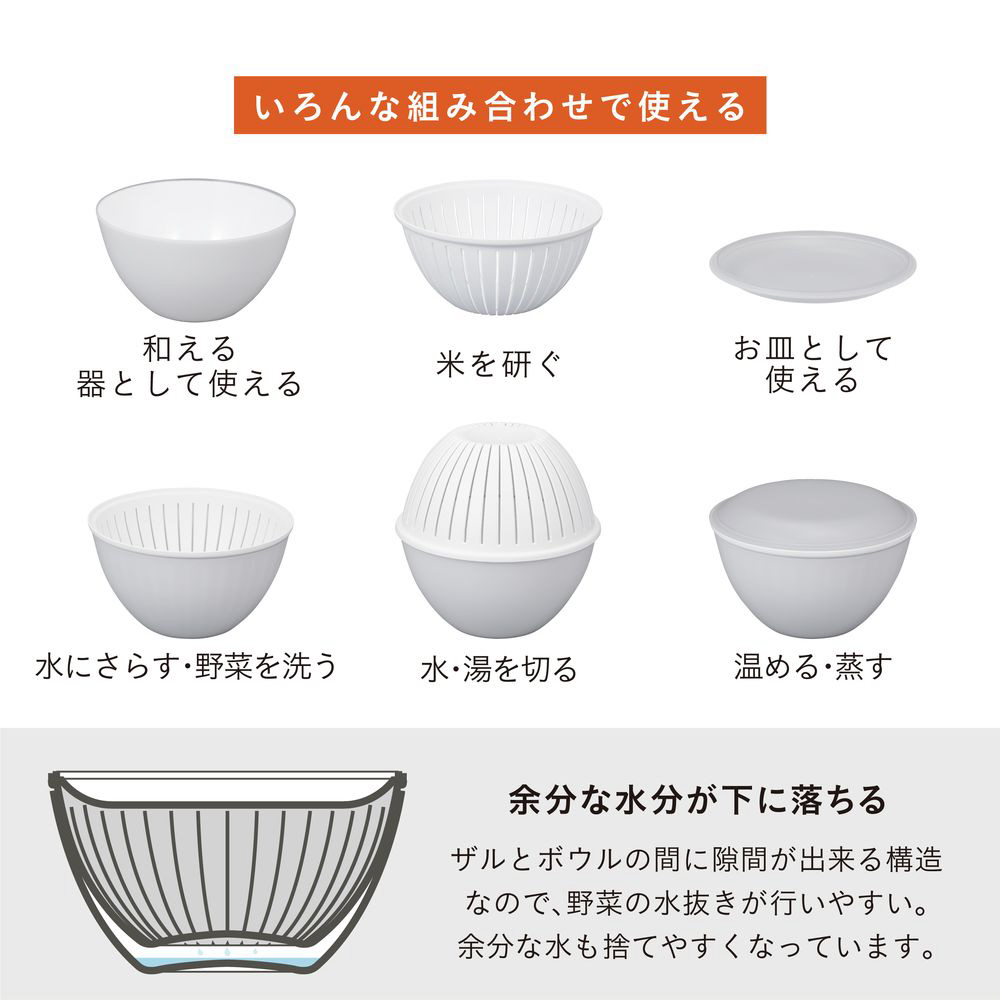 10役こなす便利なザルボウルセット!野菜の水切りから蒸し調理、電子レンジ加熱までこれ一つでOK。