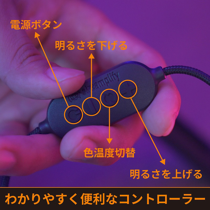 電源のオン・オフや明度、色温度など有線コントローラーにより手軽に調整することができます。