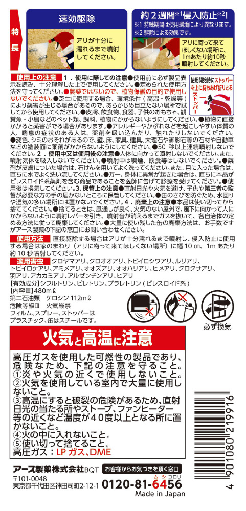 ●約2週間(※持続期間は使用環境により異なります。)侵入防止(※駆除による効果です。): アリに寄って来てほしくない場所に、1mあたり約10秒噴射してください。