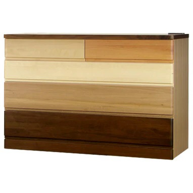 異なる無垢材を組み合わせた個性的なデザインと、色味のコントラストが美しい幅1105mmの4段ローチェストです。
