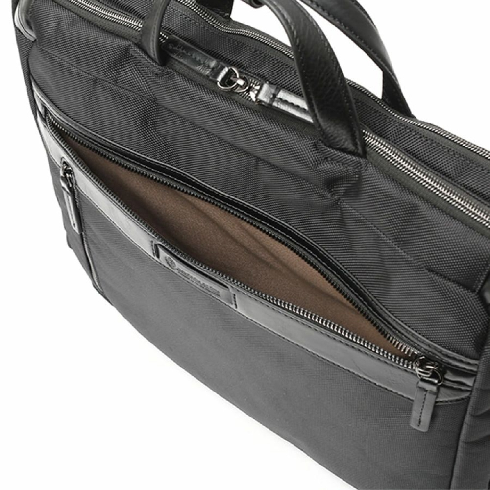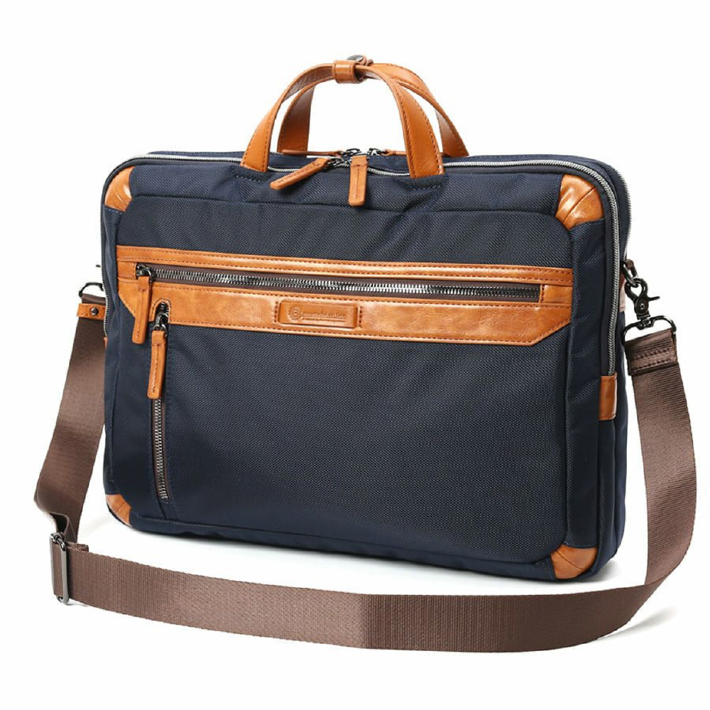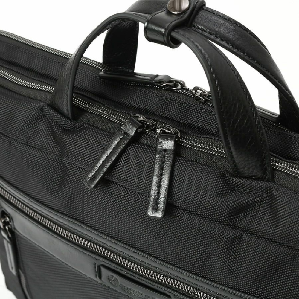 本体には1680デニールの高耐久ポリエステル生地を採用。合皮と牛革を組み合わせたコンビ素材で、カチッとしたスーツスタイルやビジカジュアルにぴったりの洗練されたデザインです。