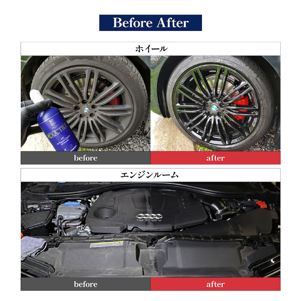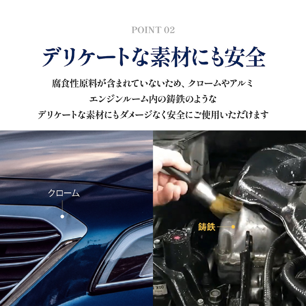 腐食性原料が含まれていないため、クローム、アルミ、エンジンルーム内の鋳鉄などのデリケートな素材にもご使用頂けます。
